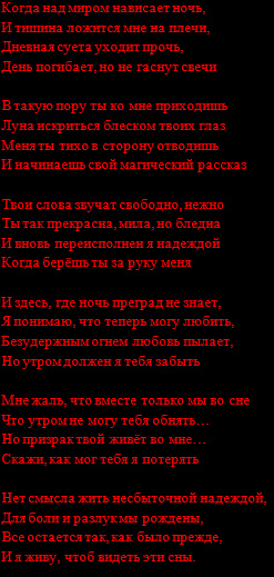 отлично)) я тоже сча свой выложу) Когда над миром нависает ночь это от лица девушки писал)) давно) 29.01.2011 в 01:39